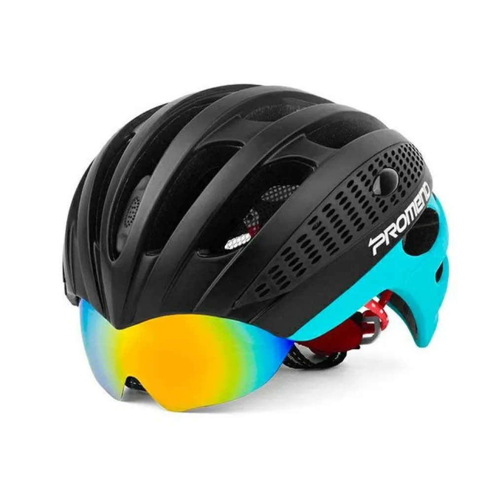 Шлем велосипедный PROMEND G3 черно-голубой- привлекательный современный аксессуар гарантирует стопроцентную защиту райдера при скоростной езде. Обтекаемая конструкция оснащена 27 воздушными отверстиями, обеспечивает полноценную циркуляцию воздуха при скоростной и продолжительной езде, не вызывает дискомфорта. Пристегивающийся визор обеспечивает защиту от ультрафиолетовых лучей, пыли и других неблагоприятных факторов. Наличие 3-х цветных линз обещает комфортную езду и отличную видимость в разной время суток. Фиксация аксессуара проводится с с помощью надежного ремешка.