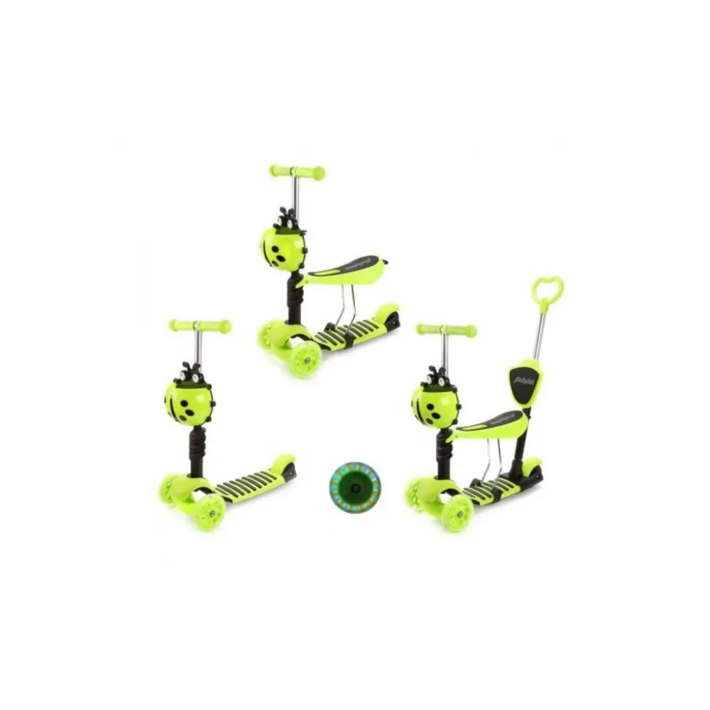 Детский самокат-трансформер Moby Kids 3 в 1 по достоинству оценят дети и их родители. Яркий привлекательный дизайн придётся по душе даже самым юным пользователям. Божья коровка на рулевой стойке выполняет не только декоративную функцию, но и служит для хранения мелких вещей. Данная модель представляет собой многофункциональный транспорт, которым могут пользоваться малыши возрастом от одного года. Управляет самокатом в данном случае взрослый при помощи специальной ручки, а ребенок может комфортно откинуться на мягкую спинку, держась за удобные ручки с ограничителем. Убрав ручку, вы получите беговел, на котором ребёнок передвигается сидя, попеременно отталкиваясь обеими ногами. После снятия сидения беговел превращается в настоящий самокат и ваш малыш может смело осваивать новый вид транспорта! Платформа с нескользящим покрытием обеспечивает устойчивое положение ног, позволяя ребёнку чувствовать себя безопасно и полностью сконцентрироваться на управлении. Два передних колёса оснащены светодиодами, которые излучают разноцветное сияние во время движения, радуя юного водителя при каждой поездке. Благодаря регулировке руля самокат «растет» вместе с ребёнком, что позволяет использовать одно транспортное средство в течение нескольких лет.