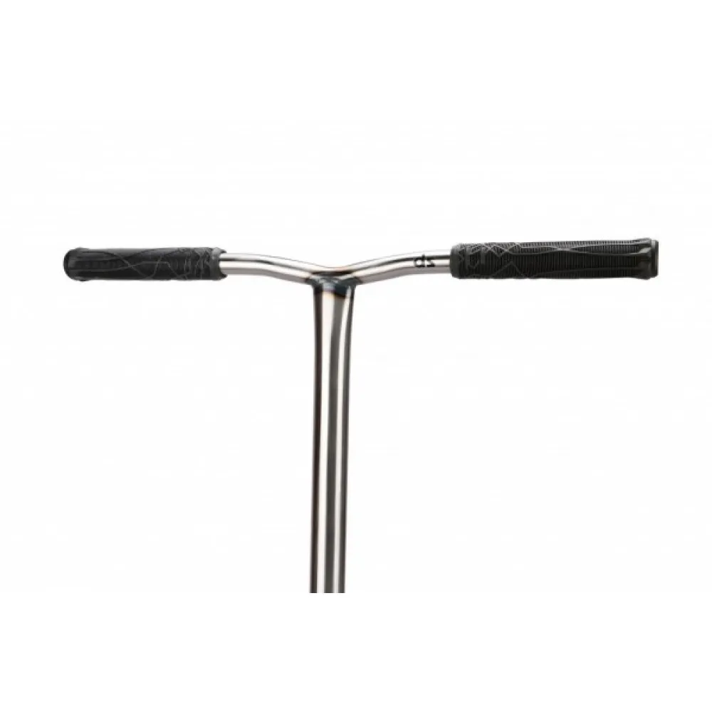 Алюминиевая вилка (вылет составляет 10 мм) надежно крепится к рулевой стойке. Руль (с внешним диаметром 34,9 мм Oversized) изготовлен из высококачественной стали 640*580 мм. Дека 520*120 мм изготовлена в соответствии с требованиями и пожеланиями райдеров. Жесткость полиуретановых колес (110 мм) составляет 88 А.